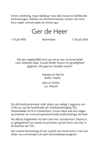 Het was de wens van Ger om de rouwkaart via deze weg met jullie te delen zodat iedereen die dat wil vrijdag afscheid kan nemen.