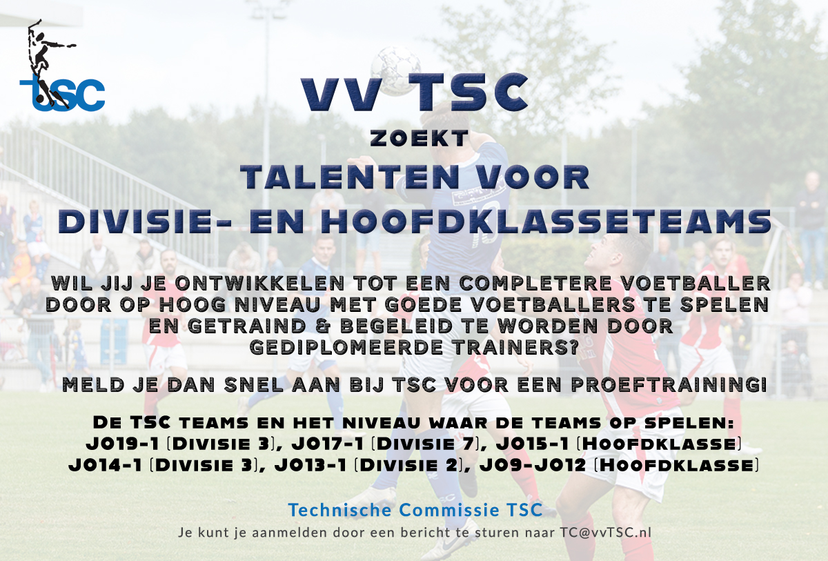 Als TSC zijn wij op zoek naar talentvolle voetballers die zichzelf verder willen ontwikkelen om een complete speler te worden door te spelen op hoog competitief niveau wedstrijden te spelen, minimaal hoofdklasse, en getraind te worden door goede gediplomeerde TSC trainers.